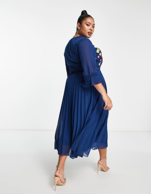 ASOS DESIGN Curve lace insert pleated midi dress with embroidery in navy Very well made.