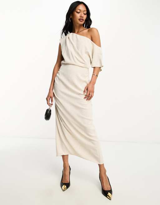 ASOS DESIGN linen fallen shoulder ruched midi dress in rust ASOS Very well made.