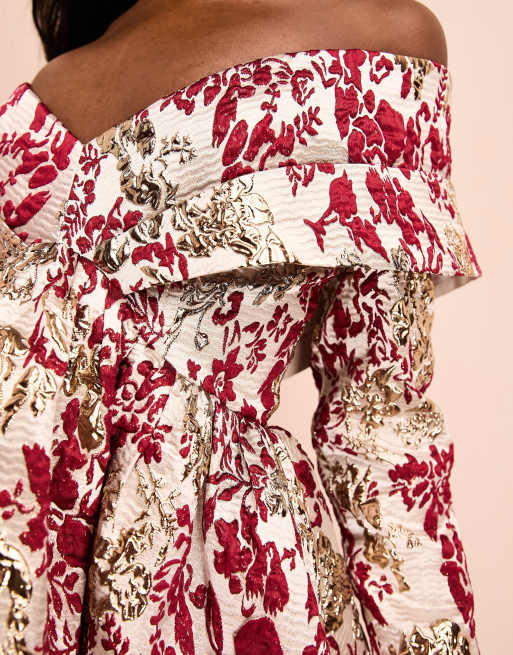 ASOS LUXE Robe patineuse courte en jacquard fleuri avec paules d nud es Bordeaux noir Very well made.
